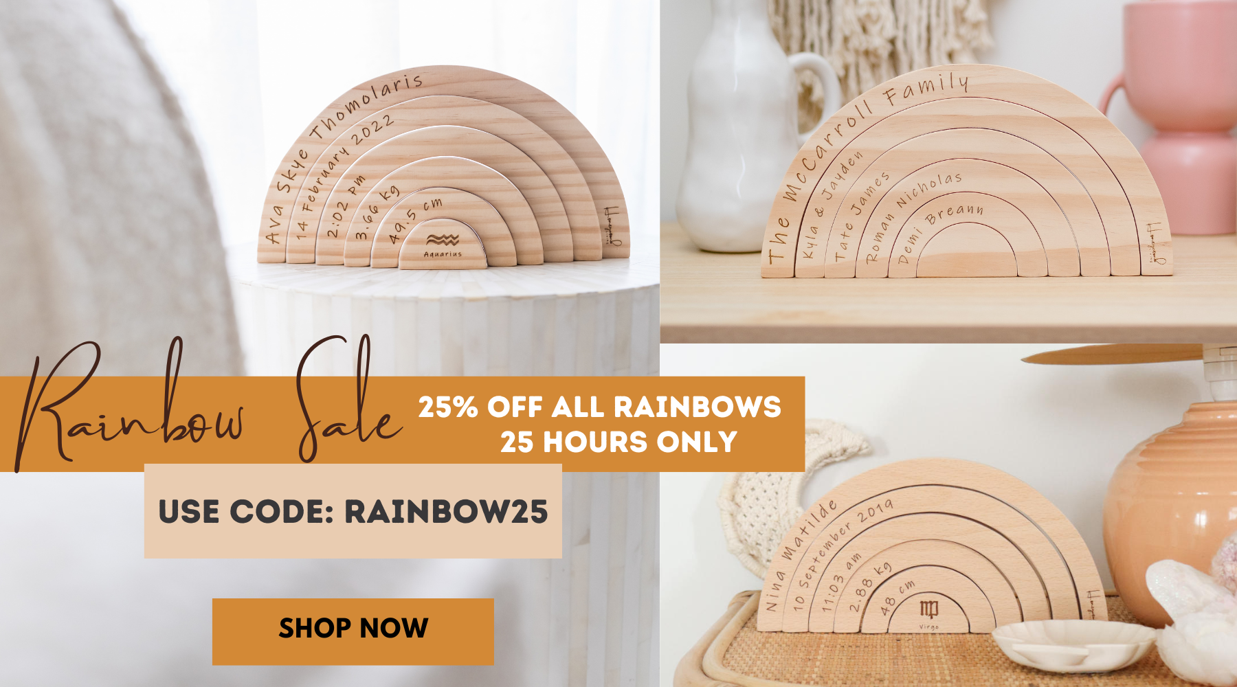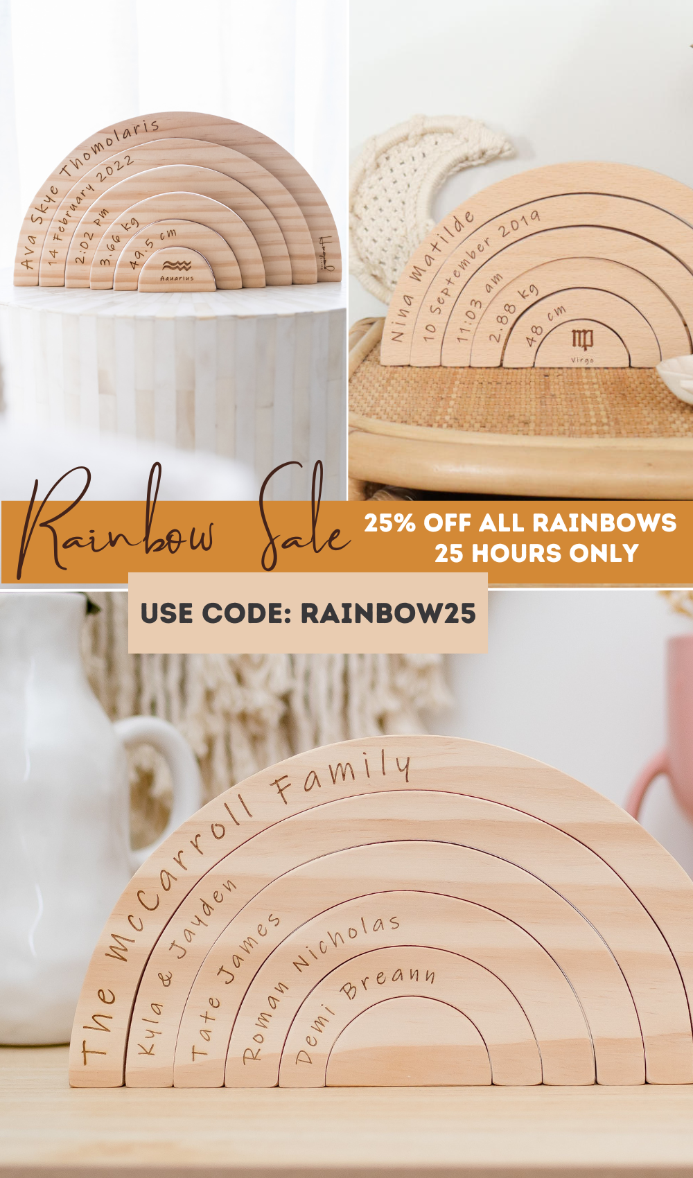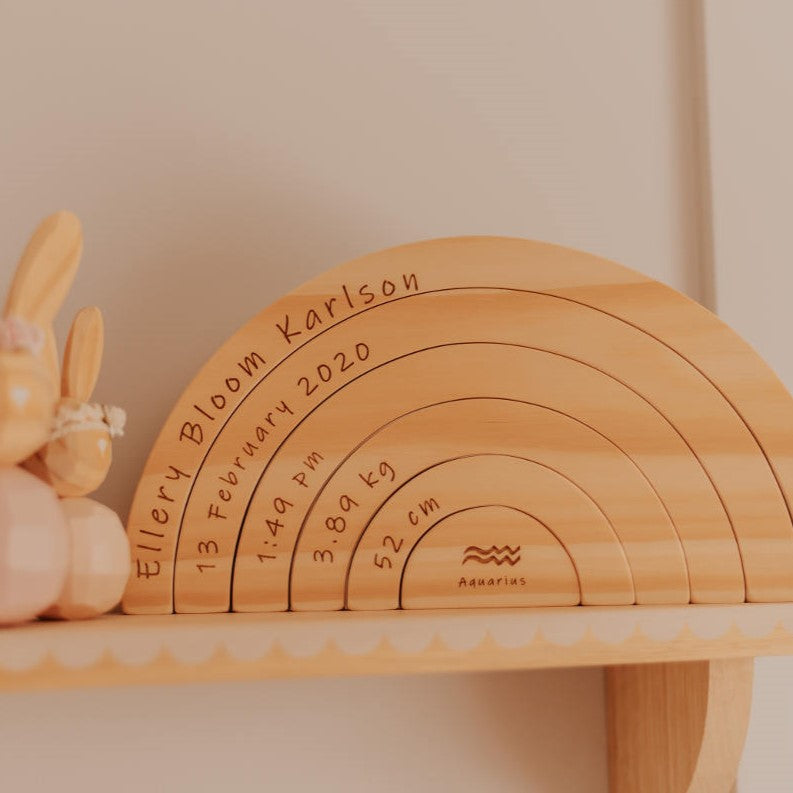The original Birth Rainbow, a unique and sentimental gift for babies. Birth details are engraved on to a beautiful handcut timber rainbow. These are our most beloved product that our customers love buying for their own babies and coming back to gift to their loved ones when they have their babies too.