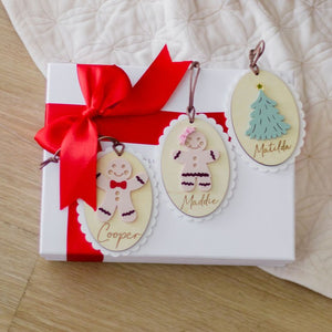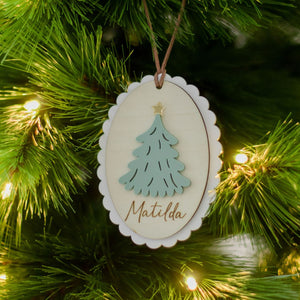 This layered decoration blends warm timber with white scallops, green acrylic, and gold mirror accents for a truly beautiful keepsake that shines among the branches.