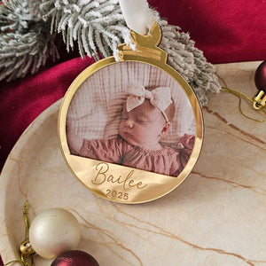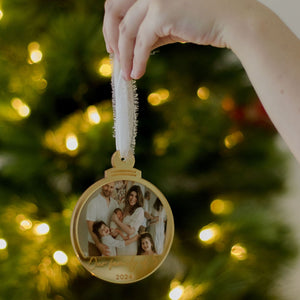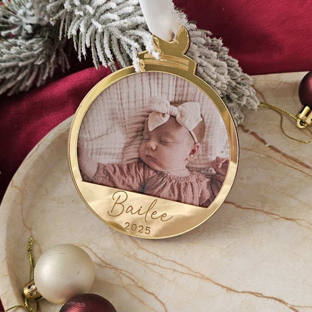Capture a treasured memory and turn it into a keepsake you’ll cherish forever. Simply upload your favourite photo, and we’ll get it printed onto a wooden bauble, finished with a touch of gold mirror acrylic engraved with your chosen name, short statement or year.