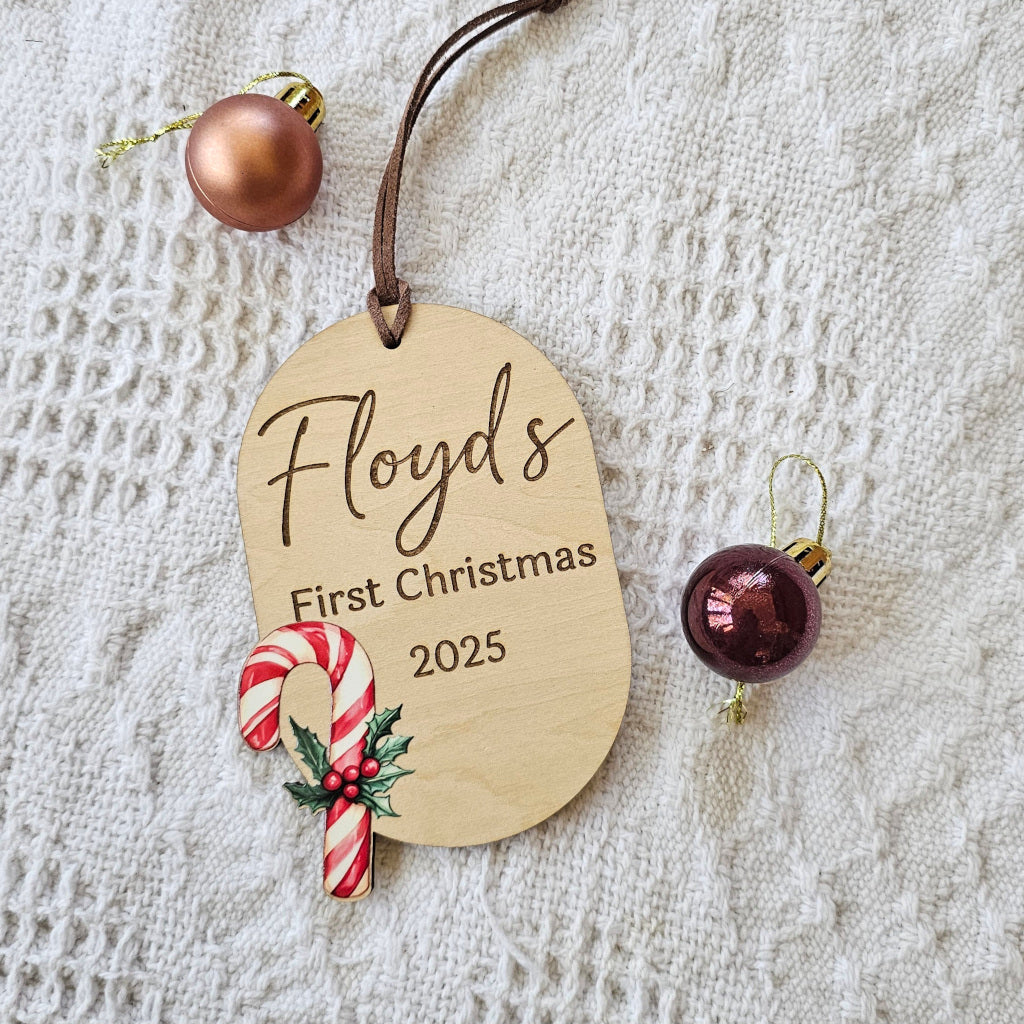A beautiful first Christmas decoration with festive printed watercolour designs, it looks great on the tree and is a beautiful keepsake for a baby's first Christmas. It measures approximately 15cm long and 10cm wide.