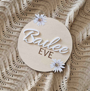 This round name plaque is 15cm in diameter and cut from 3mm sustainably sourced timber.