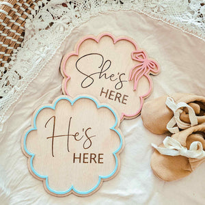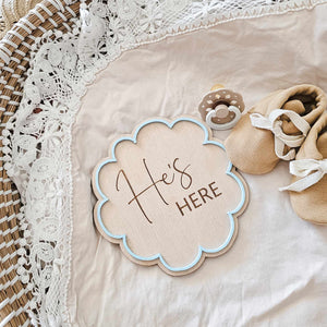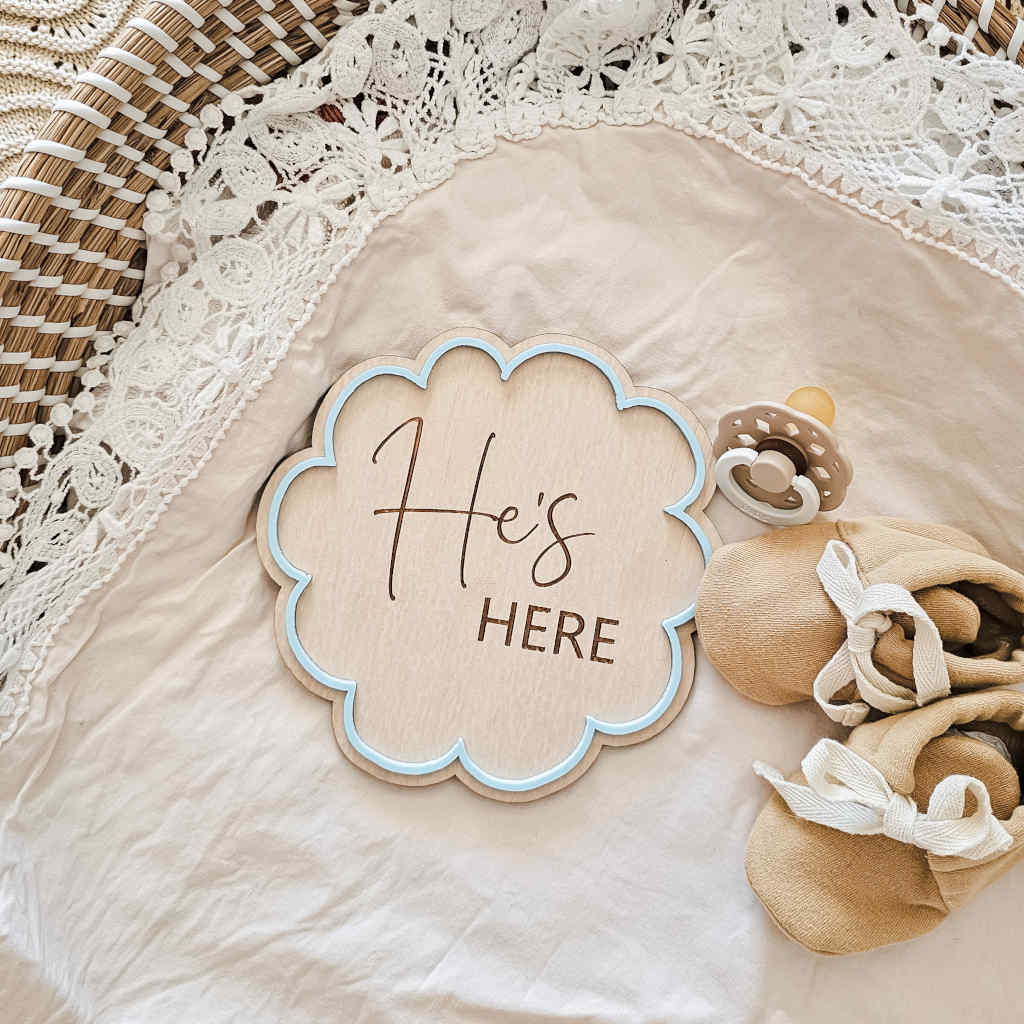 If you are expecting your precious baby boy soon, this He's here plaque with sweet Scalloped design in blue is the cutest way to announce his arrival.